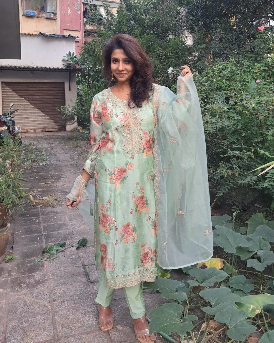 Modal satin silk primed top with mirror and moti work with organza dupatta.